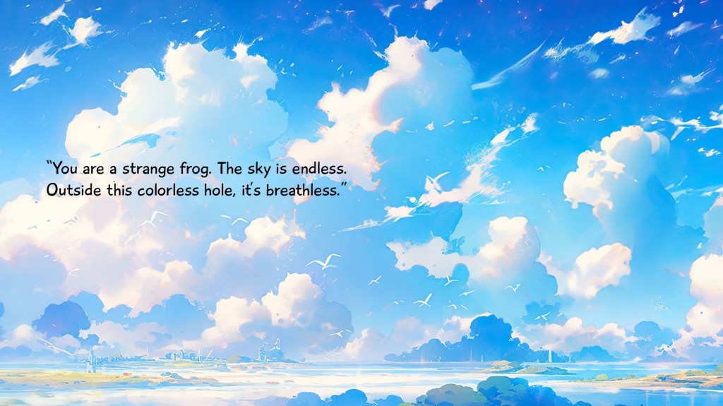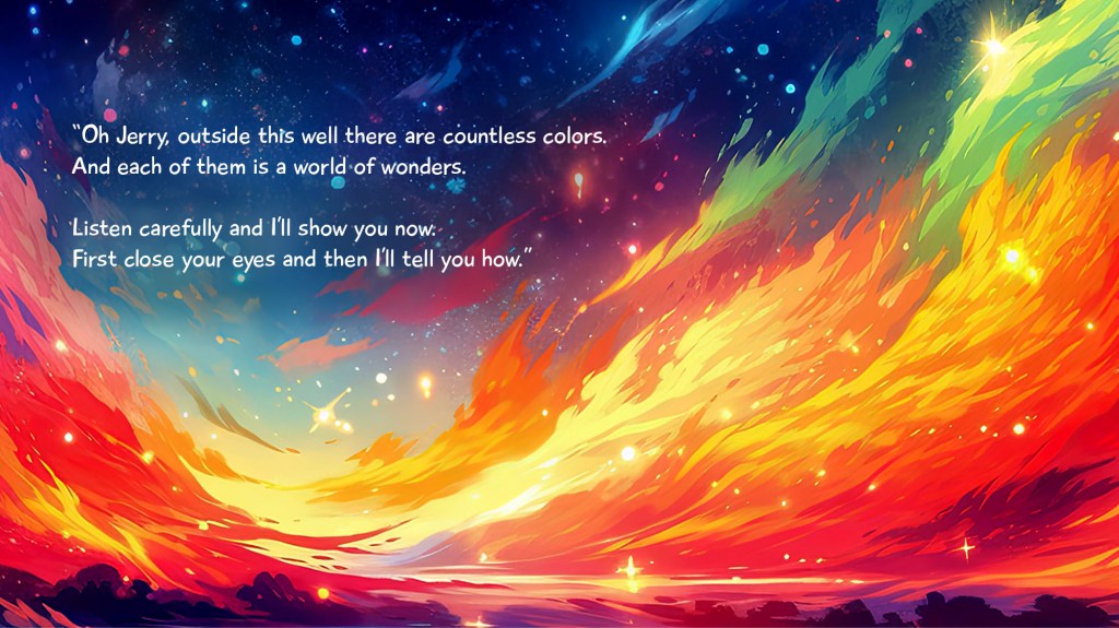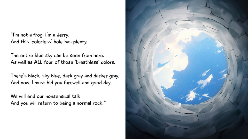 Based off a Chinese fable, a frog named Jerry has lived inside a drab well his entire life thinking there are only 4 colors and that the sky is the size of his palm. A talking rock named Anna falls into his home and speaks of a colorful world above using emotions to describe each color. In this read-aloud rhyming book, explore colors like you never have before and share the importance of open-mindedness.